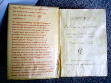 Three classic philosophical books are glued together, with Aristotle's On Man In The Universe on top. Upon opening the top cover page and the title page the altered book is revealed. A two inch diameter hole was drilled through all three books and filled with "Linguini" cut Hebrew text. On either side of the hole, are a miniature silver fork and spoon glued to the page.