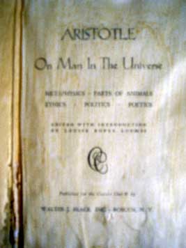Three classic philosophical books are glued together, with Aristotle's On Man In The Universe on top. Upon opening the top cover page and the title page the altered book is revealed. A two inch diameter hole was drilled through all three books and filled with "Linguini" cut Hebrew text. On either side of the hole, are a miniature silver fork and spoon glued to the page.