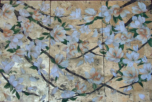 Two Magnolias Fabric collage Gold Leaf on canvas, Triptych 30" x 48"