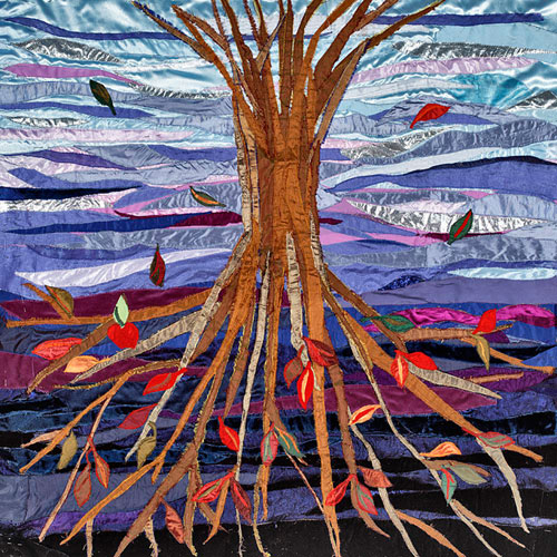 These are not traditional quilts that use specific patterns of squares. These quilts use fabric collage as a medium to create dynamic images of beloved aspects of Judaism. Painting with fabric. At the center of each quilt is a Tree of Life set upon a rich background of an evening sky, titled Chesed or Lovingkindness, and the other, a sunrise, titled Gevurah or Strength. The center panel of each of the two quilts is surrounded by twelve 18"x18" squares created by the individual participants in the project. These images include: The First Day of Creation, Women Holding the Torah, Noah's Ark, Holocaust Spirits, Ancient Hebrew Alphabet and Jerusalem to name a few of the twenty-four unique and magnificent squares.