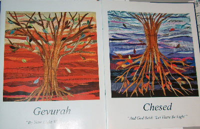 These are not traditional quilts that use specific patterns of squares. These quilts use fabric collage as a medium to create dynamic images of beloved aspects of Judaism. Painting with fabric. At the center of each quilt is a Tree of Life set upon a rich background of an evening sky, titled Chesed or Lovingkindness, and the other, a sunrise, titled Gevurah or Strength. The center panel of each of the two quilts is surrounded by twelve 18"x18" squares created by the individual participants in the project. These images include: The First Day of Creation, Women Holding the Torah, Noah's Ark, Holocaust Spirits, Ancient Hebrew Alphabet and Jerusalem to name a few of the twenty-four unique and magnificent squares.