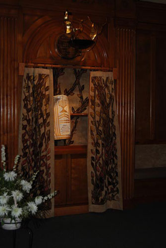 The design is based on the Tree of Life motif, with the Torah Scrolls in the branches of the tree of life, the curtains are covered with branches and leaves tinted with the colors of the four seasons. The design extends to the reading table, with branches and leaves twining up the four corners of the table. The setting is a visual invitation to enter the sacred space created by the Tree of Life which contains the Torah Scrolls. As one approaches the Ark from the reading table, and parts the 'branches' on the curtains one is metaphorically in the Tree of Life symbolized by the Torah.
