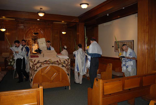 The design is based on the Tree of Life motif, with the Torah Scrolls in the branches of the tree of life, the curtains are covered with branches and leaves tinted with the colors of the four seasons. The design extends to the reading table, with branches and leaves twining up the four corners of the table. The setting is a visual invitation to enter the sacred space created by the Tree of Life which contains the Torah Scrolls. As one approaches the Ark from the reading table, and parts the 'branches' on the curtains one is metaphorically in the Tree of Life symbolized by the Torah.