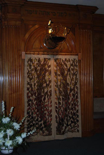 The design is based on the Tree of Life motif, with the Torah Scrolls in the branches of the tree of life, the curtains are covered with branches and leaves tinted with the colors of the four seasons. The design extends to the reading table, with branches and leaves twining up the four corners of the table. The setting is a visual invitation to enter the sacred space created by the Tree of Life which contains the Torah Scrolls. As one approaches the Ark from the reading table, and parts the 'branches' on the curtains one is metaphorically in the Tree of Life symbolized by the Torah.