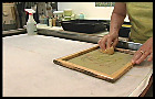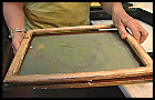3. Place the deckle (frame) on top of the mold (figure C), then place the unit into the vat and slide it toward you until the pulp has filled up the screen. Lift the mold and deckle out of the vat, keeping them level.