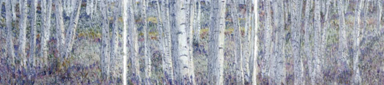 offers a lovely, placid close-up of tree trunks in Autumn Birches. Her